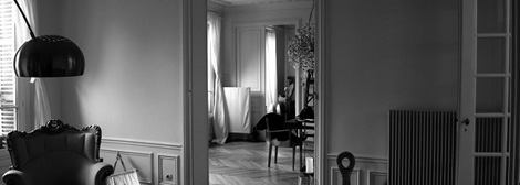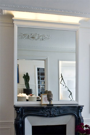 Salon: Chemine en marbre teinté en noir et cerusé création d'un grand miroir avec moulures, LED sur la corniche.