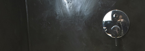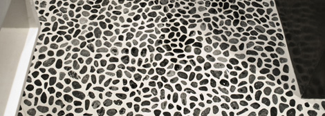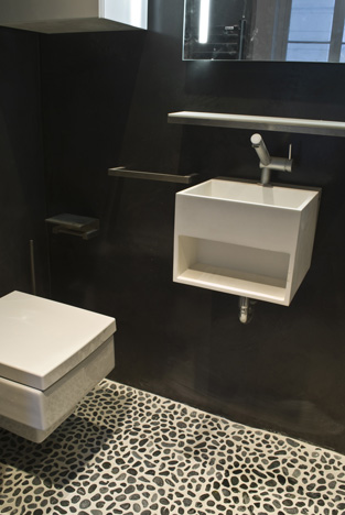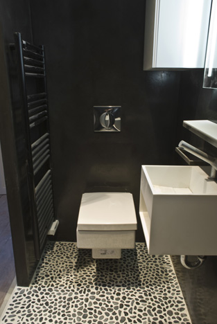 SALLE DE DOUCHE & WC2 en surelevation porte coulissante bois laqué traditionelle du Japon, esprit thalasso Japonaise design "Minimaliste". Sol avecpetit galet noir en relief et joint blanc, mur Microcemento