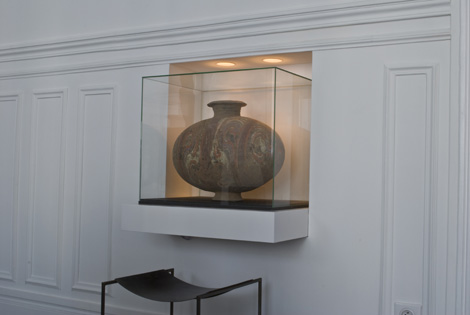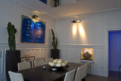 Salle à manger: Ancienne cheminee est démontée et ulilisée comme niche pour encastrer une vitrine de vase avec spotst encastrés.