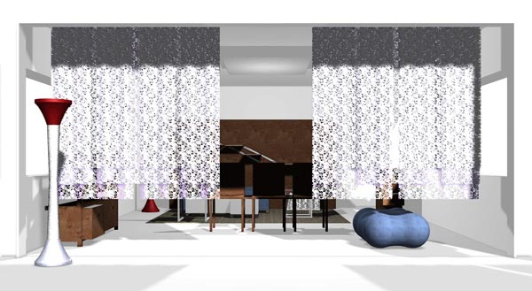 Composée de 3 couches de textile (épais et pesant), découpées au laser (pour donner une sensation de légèreté), en suspension par rapport au plafond.